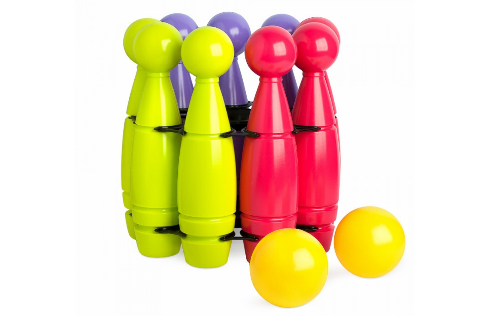 В комплекте27 кеглей / 3 держателя / 6 мячей