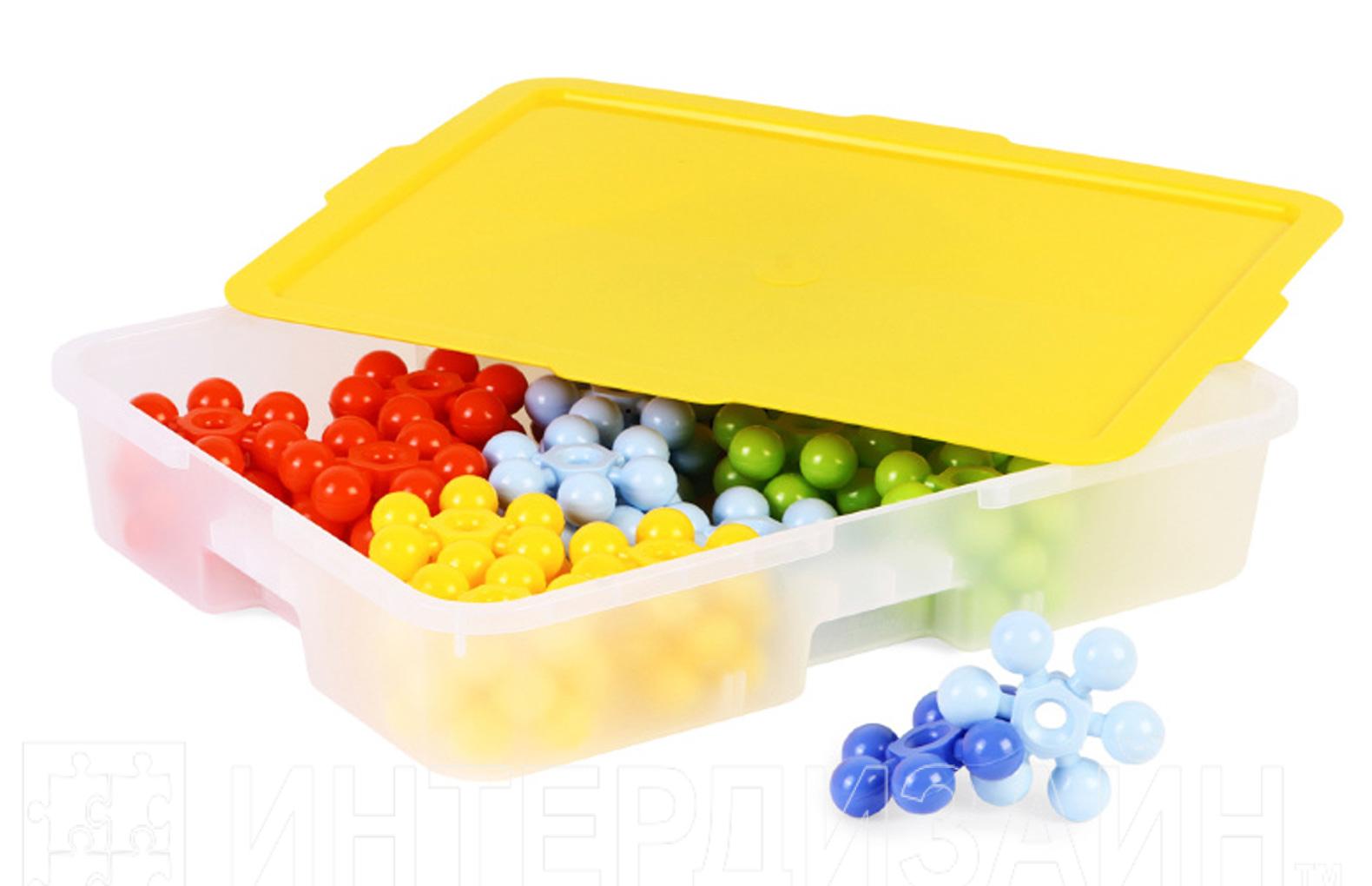 Набор деталей для конструирования для развивающих занятий и самостоятельного досуга дошкольников младших и средних групп ДОО. В составе набора 45 объемных деталей в 5 цветах, каждый элемент представляет собой кольцо с шариками. Универсальное крепление позволяет соединять детали в различных вариациях, что стимулирует мелкую моторику, воображение и пространственное мышление, развивает творческий потенциал воспитанников. Детали не имеют острых граней и мелких элементов.