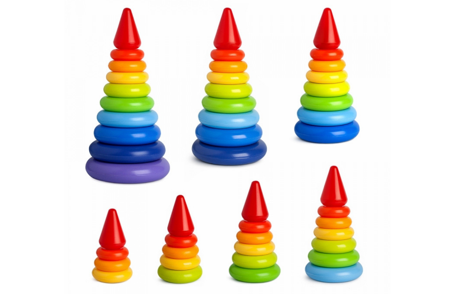 Уникальная коллекция пирамид классической формы, каждая из которых имеет на одно цветное кольцо меньше предыдущей. Комплект интересен тем, что любая его составляющая является полноценной самостоятельной игрушкой. В то же время все пирамидки в совокупности позволяют проводить с детьми уроки на развитие внимания, памяти, изучать счет, цвета и их оттенки, знакомиться с понятиями высоко — низко, большой — маленький. Часть деталей является взаимозаменяемыми.