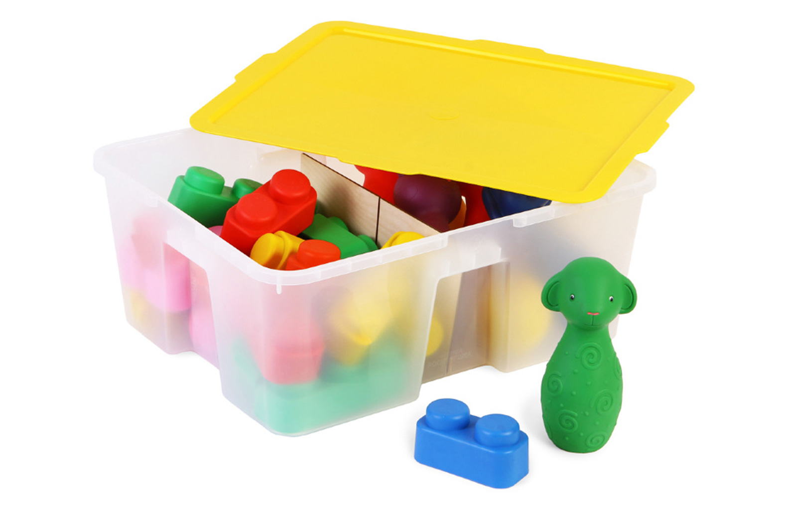 В составе:конструктор из мягкого материала, тактильные мини-кегли, мячик, контейнер Игротека №2.