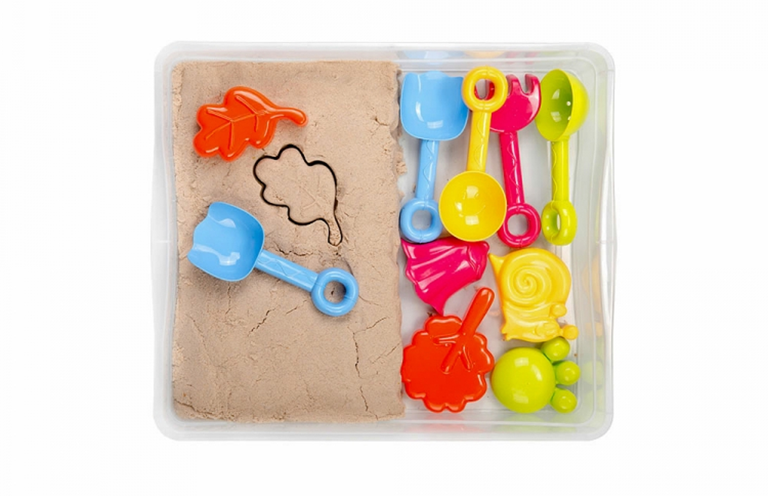 Сенсорный комплект в настольной песочнице: Мультипесок 3 кг, инструменты, формочки - Описание