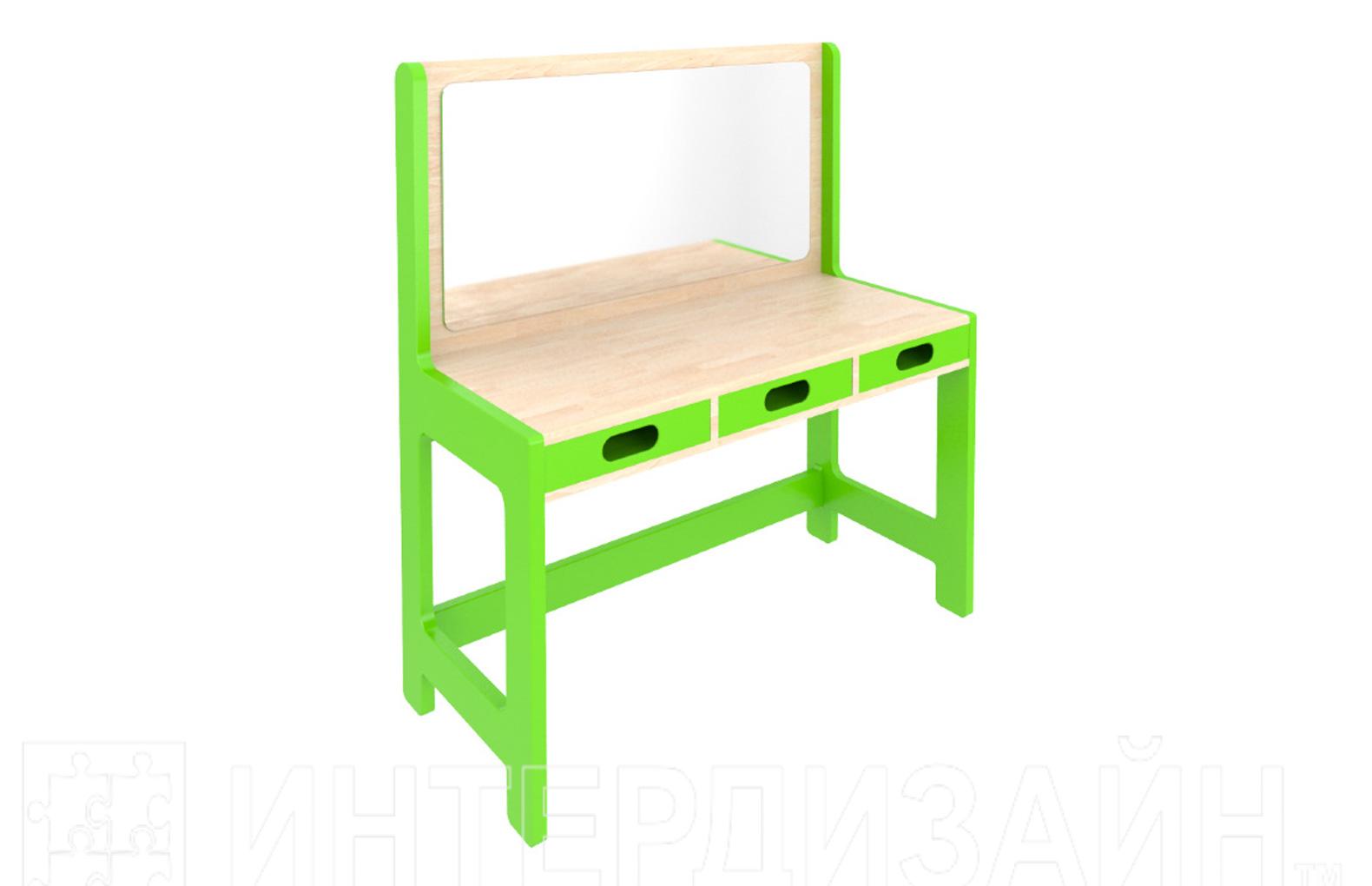Характеристики изделия: размер 111х111х111 мм, материал – массив светлой древесины с окрашенными в зеленый цвет элементами. Высокая функциональность стола обеспечена необычной конструкцией столешницы, которая позволяет проводить все виды занятий непосредственно на рабочем месте. Под столешницей размещены три вместительных ящика для дидактических материалов, игрушек и методических пособий.