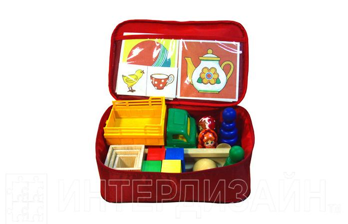 методическое руководство, бланк фиксации результатов, желобок, три коробочки четырехугольной формы, три шарика одинакового цвета, две матрешки, две пирамидки, восемь цветных кубиков, тележка (машинка), две тесемки, шарик-погремушка, набор счетных палочек, набор цветных фломастеров, набор парных картинок, набор разрезных картинок, карандаш, фирменная сумка.