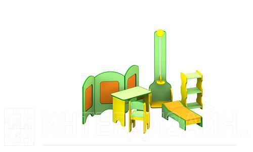 Состоит из шести предметов. Стол и стул предназначены для детей. Оригинальная стойка для лекарств и ростомер дополняют уголок и делают его похожим на кабинет врача. На диване можно положить «больную» куклу, измерить температуру и другое. С помощью ростомера – измерить куклу. Игры в уголке закрепляют и систематизируют знания детей о труде взрослых, профессиях врача, медицинской сестры.