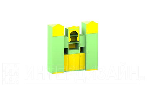 Стенка это универсальная мебель для детских садов и школ. Она занимает максимум пространства, при этом обладает большой универсальностью. Совмещает как открытые полки, дети смогут хранить там свои подделки, игрушки, книжки и сувениры. Так и закрытые шкафчики, малыши смогут положить туда свои курточки, обувь и другие личные вещи. Стенка выполнена в оригинальном дизайне, специально разработанном под учебные заведения. Сочетание желтого и зеленого будет радовать не только детей, но и взрослых.