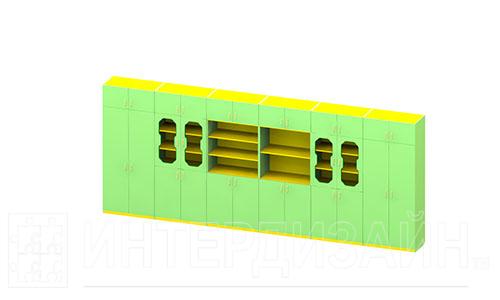 Стенка это универсальная мебель для детских садов и школ. Она занимает максимум пространства, при этом обладает большой универсальностью. Совмещает как открытые полки, дети смогут хранить там свои подделки, игрушки, книжки и сувениры. Так и закрытые шкафчики, малыши смогут положить туда свои курточки, обувь и другие личные вещи. Стенка выполнена в оригинальном дизайне, специально разработанном под учебные заведения. Сочетание зеленого и желтого будет радовать не только детей, но и взрослых.
