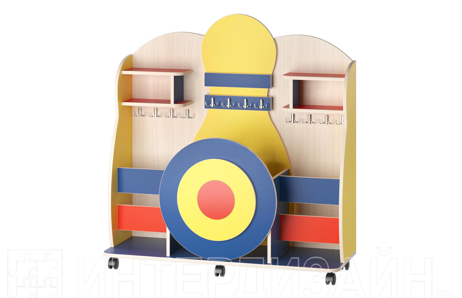 Уголок спортинвентаря удобен тем, что он разделен на несколько зон, которые помогут приучить детей к порядку. Есть специальный ящик, в который удобно убирать кегли, мячи и др. На кручки можно повесить кольца, ленточки, прыгалки и др.