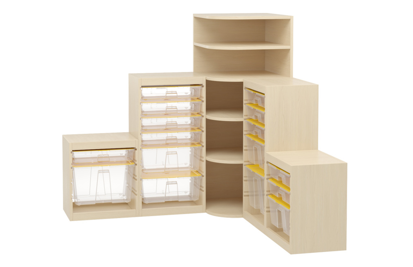 Угловая система хранения состоит из 5 стеллажей и контейнеров с крышками и обеспечивает компактное и наглядное хранение игровых и дидактических материалов в ДОО.