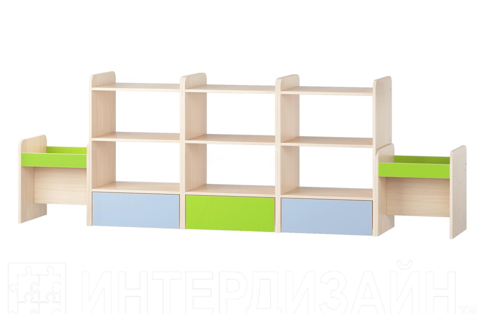 Стеллаж "двухсторонний ": ЛДСП, длина - 2650 мм, глубина - 450 мм, высота -900 мм . Продукция имеет надлежащие сертификаты качества.Удобная и вместительная модель с большими выкатными ящиками, открытыми полками , куда Вы можете поставить игрушки, книги, демонстрационный материал и другие пособия для занятий . А оригинальное оформление стенки поможет создать в игровой комнате яркую, красочную и интересную обстановку.Материал исполнения: ламинированная ДСП толщиной 16 мм, цвет — "бук бавария светлый,все торцы обработаны кромкой ПВХ . Все выступающие углы скруглены по радиусу 50 мм. Имеет крепление стеллажа к стене. Цветовое разрешение возможно по желанию заказчика.Стенка функционально используется для хранения игрушек и пособий в дошкольных учреждениях.