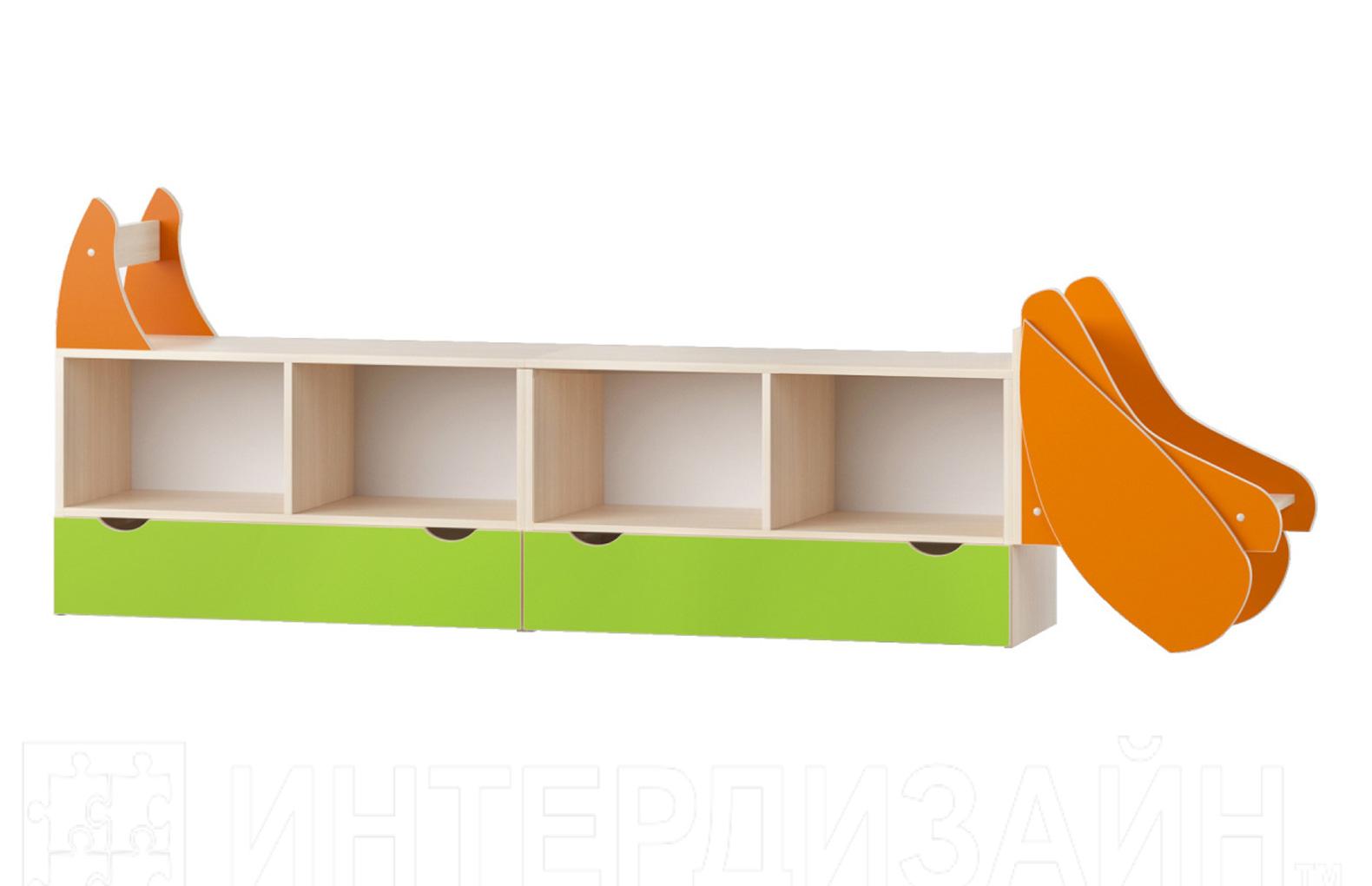 Стеллаж "Такса", длина - 2400 мм, глубина - 400мм, высота - 920 мм. Предназначен для хранения игрушек, книг, наглядных пособий, дидактического материала, наборов детского творчества и т.д. Стеллаж изготовлен из ЛДСП 16 мм, все торцы обработаны кромкой ПВХ . Выступающие углы скруглены по радиусу 50 мм. Имеет крепления стеллаж к стене. Продукция имеет надлежащие сертификаты качества