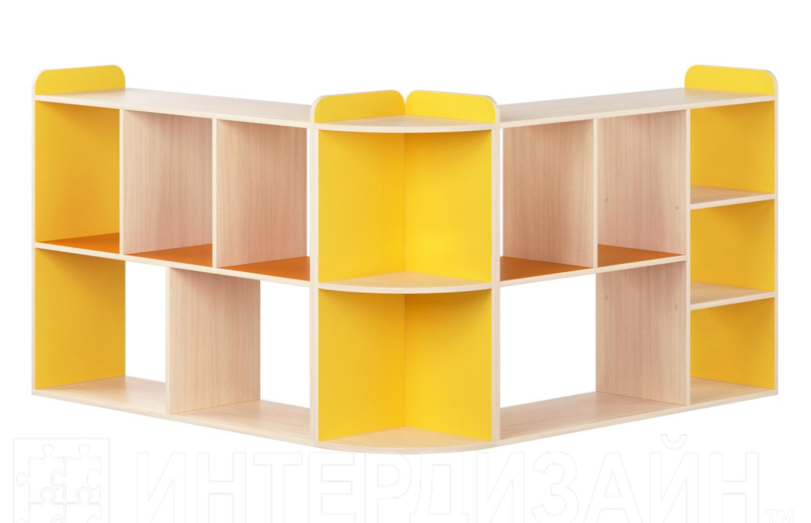Стеллаж" Угловой-3". Размеры:2700х350х950 мм. Стеллаж изготовлен из ЛДСП 16 мм кромка ПВХ 0,4 мм. Расцветки ЛДСП - дуб молочный,голубой , синий, желтый, оранжевый, красный,розовый,ваниль , зеленый. Стеллаж состоит из модулей: Модули с открытыми двусторонними полочками, модуль угловой с закругленными полочками.