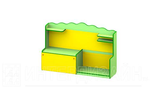 Имеет достаточно большой объем, имеет полочку с отверстиями для флажков, колечек. В нижний шкаф можно убрать большое количество игрушек и различных мелочей. Красочно оформленный дизайн побуждает детей к дисциплине и порядку.