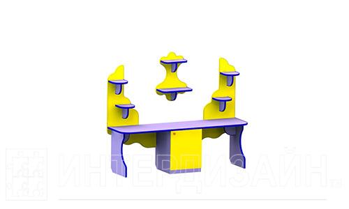 Изготовлен в виде широкой столешницы с тумбой, в которую можно поместить пособия для рисования, лепки, аппликации. На полочки можно поставить стаканчики с карандашами, кистями и другими наборами для творчества. Сочетание фиолетового и желтого порадует не только детей, но также и взрослых.