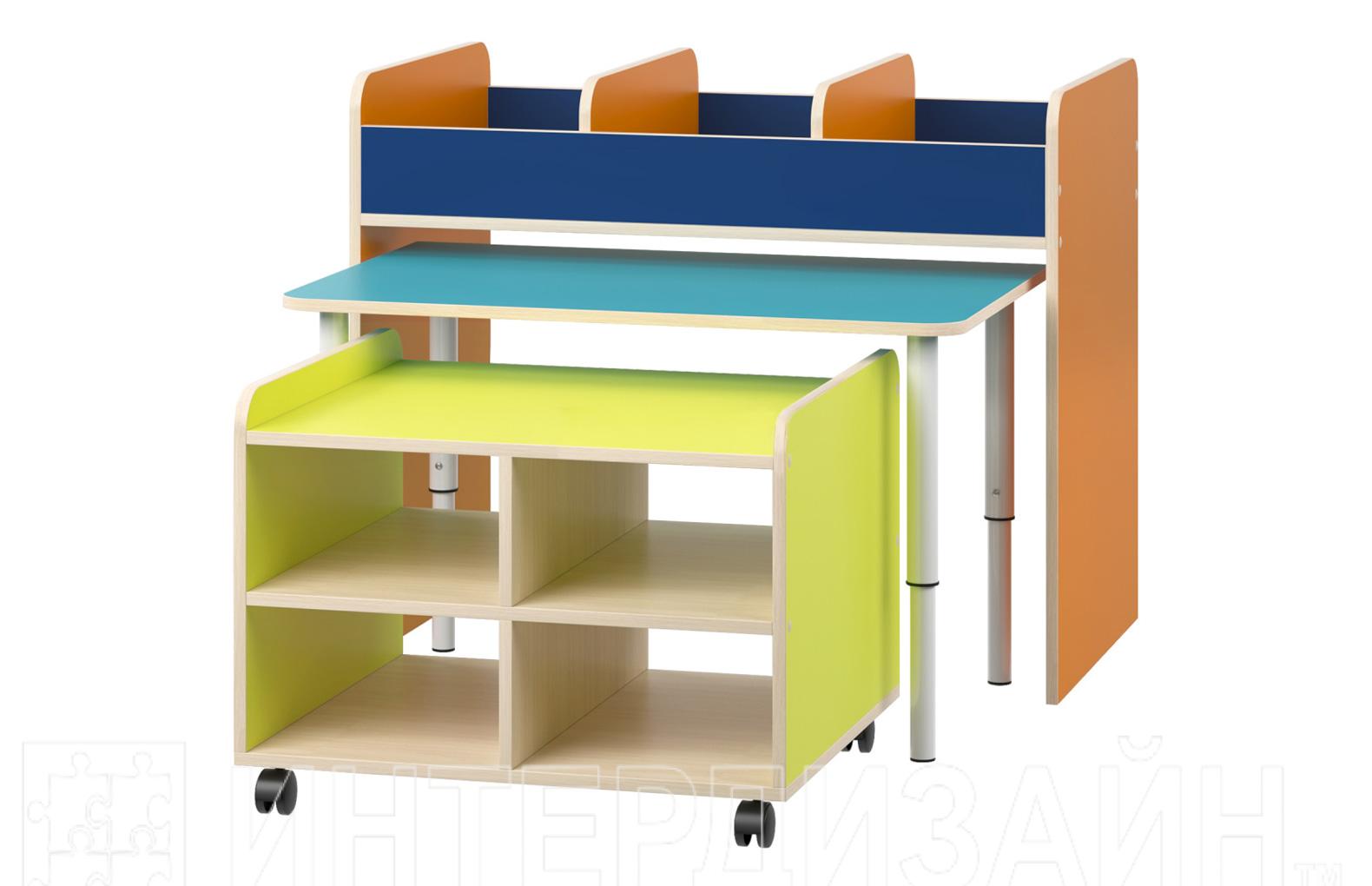 Многофункциональный компактный модуль для развивающей деятельности с тумбой-витриной для хранения книг и пособий, прямоугольным столом на рег.ножках и тумбой с корзинами на колесах. Уголок предназначен для выполнения множества задач: демонстрация - вместительные ячейки для книг, занятия - широкий стол для 2 детей, хранение - мобильная тумба с корзинами для игрушек, мелких и крупных элементов игр, пособий для рисования, лепки, аппликации и др. Колеса оснащены специальными стопорами для предотвращения произвольного движения. В комплект входят Тумба с ячейками 106х48х78; Стол прямоугольный на рег.ножках, выкатной 100х47х46-52-58; Тумба выкатная 75х45х43; Набор корзин 4 шт.) Используемые материалы: ламинированное ДСП толщиной 16 мм со стойким покрытием против воздействия воды и моющих, дезинфицирующих средств, защищенное противоударной кромкой ПВХ