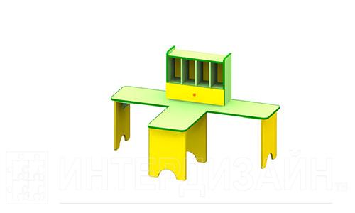 В этой зоне столы расположены так, что детям удобно подойти к ним с любой стороны. Сочетание ярких цветов делает ее привлекательной. На столешнице крепится небольшой шкафчик для пособий.