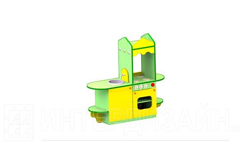 Кухня в красочном исполнении, по форме напоминает русскую печь. Имеет все необходимые атрибуты для сюжетно-ролевой игры: плиту, емкость для мытья посуды, тумбу для хранения посуды, полочки, крючки. Кухня украшена треугольными козырьками, волнистой аркой. Необычный вариант модели позволяет детям одновременно выполнять разнообразные действия, не мешая друг другу, у них воспитываются навыки работы в коллективе.