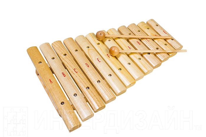 "Ксилофон – ударный музыкальный инструмент, имеет древнее происхождение — простейшие инструменты подобного типа встречаются у разных народов Африки, Юго-Восточной Азии и Латинской Америки. В Европе первые упоминания о ксилофоне датируются началом XVI века. Представляет собой ряд деревянных брусков разной величины, настроенных на определённые ноты, по которым ударяют палочками. Инструмент может использоваться как соло, так и в ансамбле. Ксилофон поможет развить музыкальный слух ребенка, чувство ритма, и при этом настолько легок в применении, что даже у малыша, не владеющего нотами, обязательно получится мелодия. У данной модели 12 деревянных брусочков, соответствующих нотам, и 2 палочки. Состав: металл, дерево