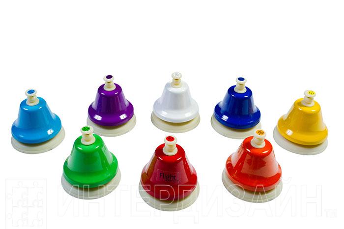 В наборе 8 цветных колокольчиков, каждый из которых настроен на определенную ноту.