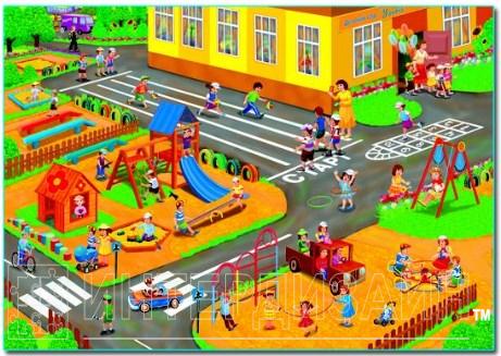 Увлекательная и познавательная игра для использования в дошкольных заведениях. В картонной коробке находится игровое поле, на котором изображены игры и развлечения, доступные детям во время прогулки в детском саду и 12 карточек с фрагментами того же изображения.