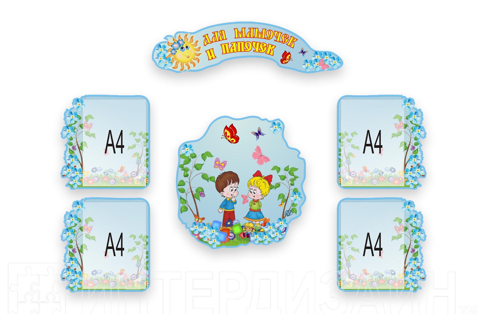 Композиция «Для мамочек и папочек» с 4 карманами А4 из влагостойкого суперплотного картона, устойчивого к перепадам температур. Поверхность стендов можно протирать влажной губкой.