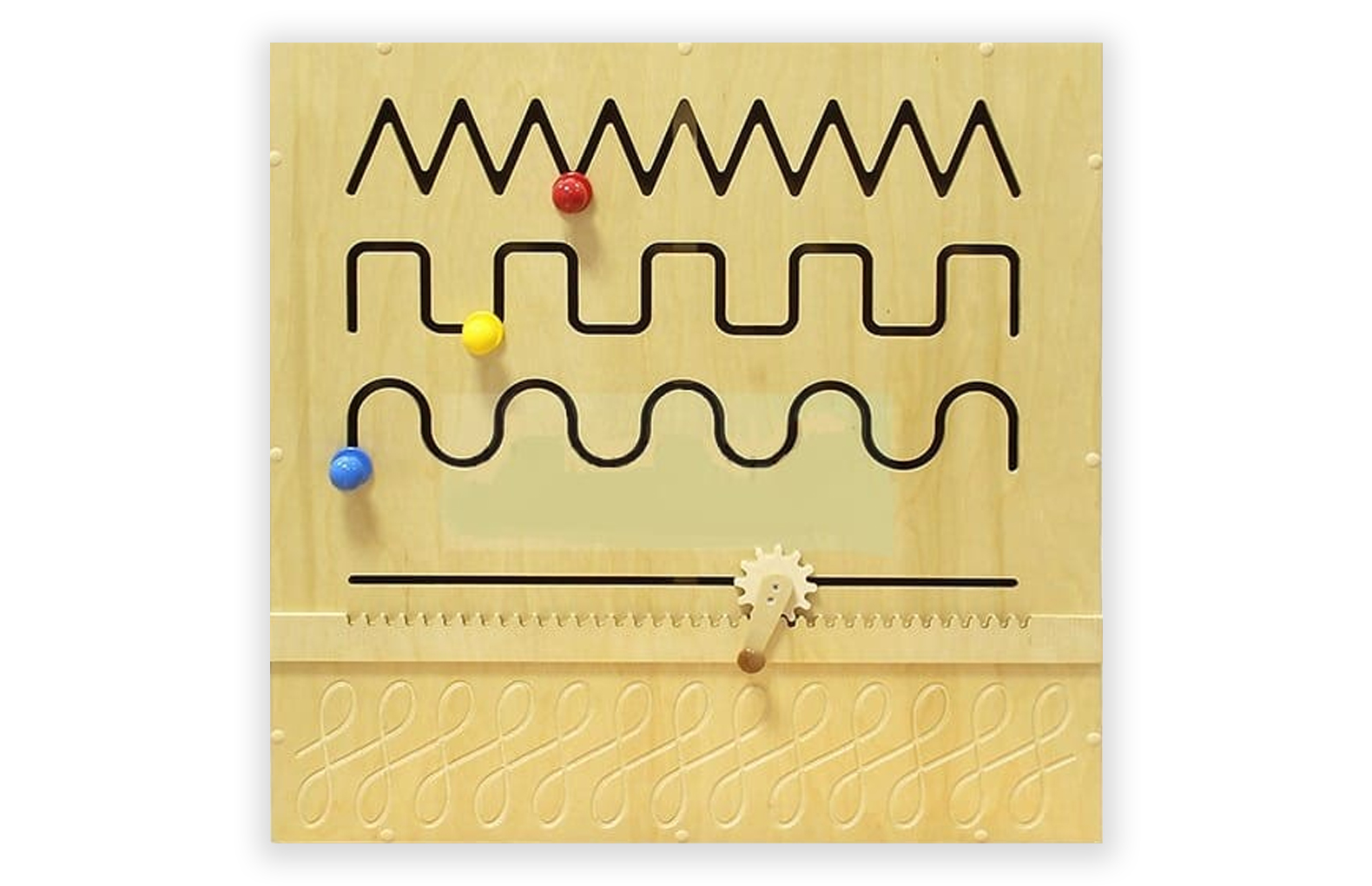 Игровая панель «Лабиринт-колесо» развивает координацию движений, ловкость рук, усидчивость и логическое мышление, дает понятие о взаимодействии предметов и законе всемирного тяготения. Задача ребенка — провести шарик из начальной точки лабиринта в конечную за наименьшее время.