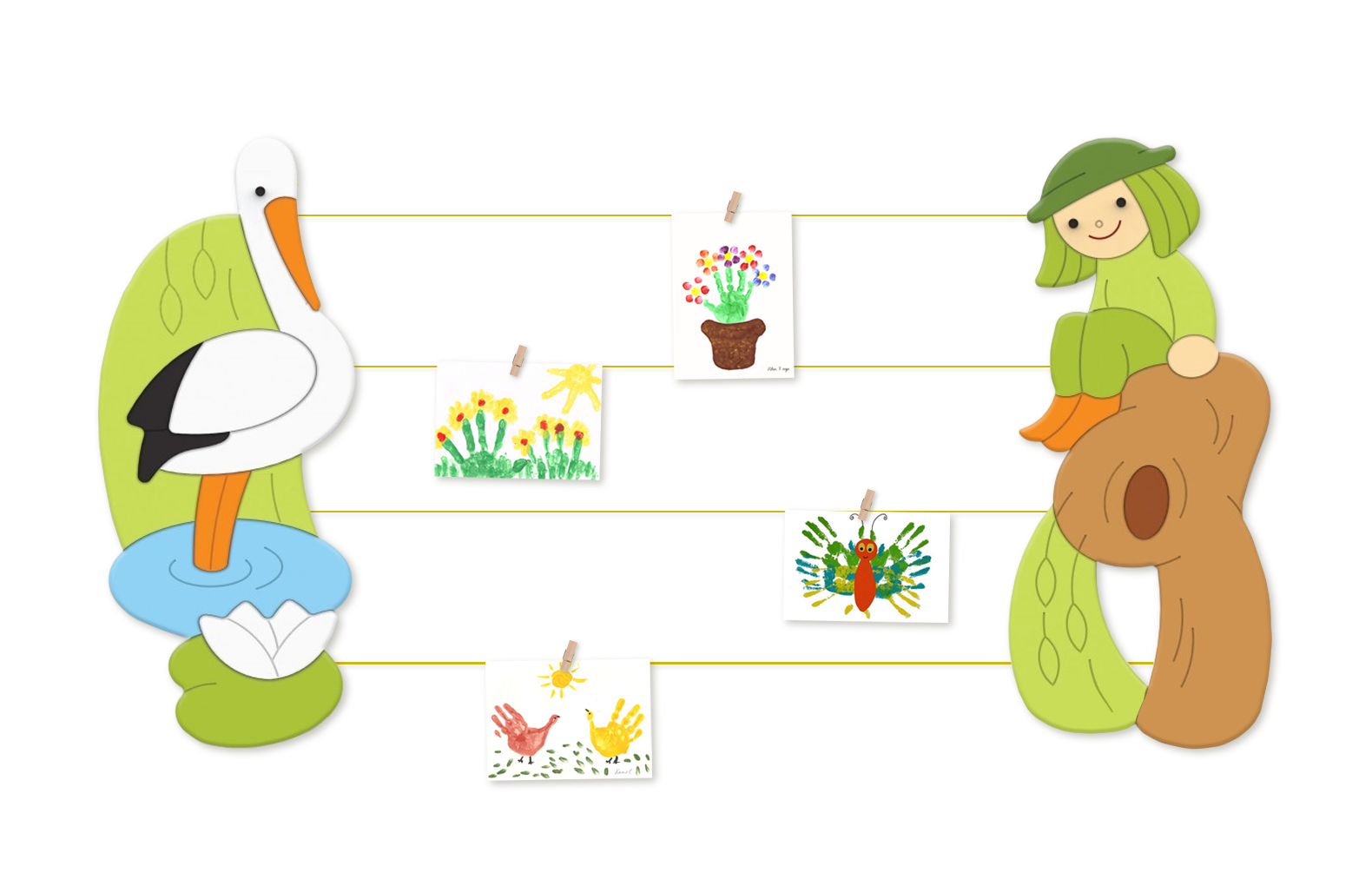 Рисунки и информация крепятся на элементы с помощью декоративных прищепок.