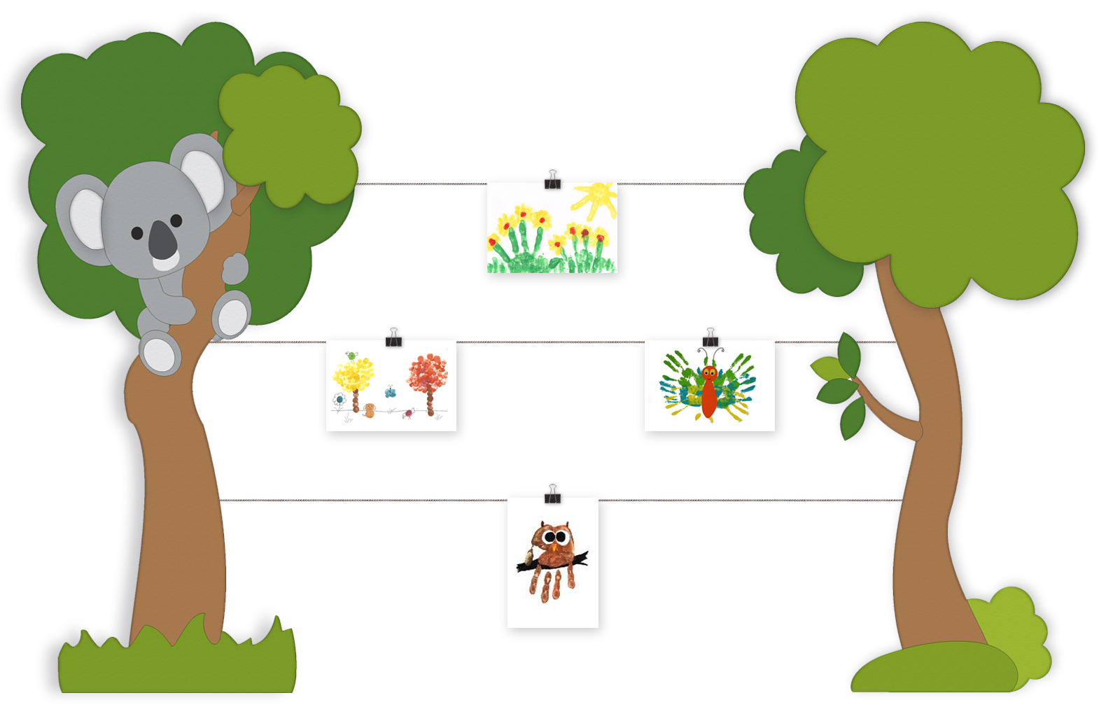 Рисунки и информация крепятся на элементы с помощью декоративных прищепок.