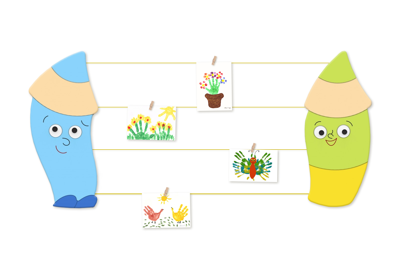 Рисунки и информация крепятся на элементы с помощью декоративных прищепок.