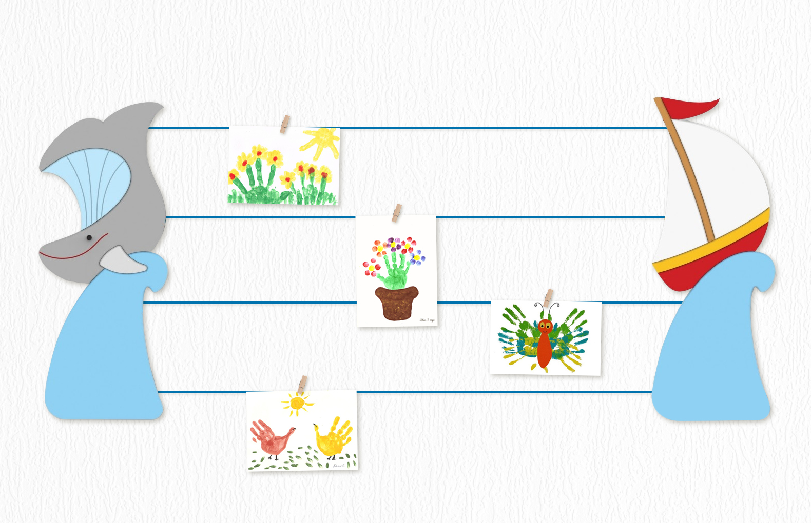 Рисунки и информация крепятся на элементы с помощью декоративных прищепок.