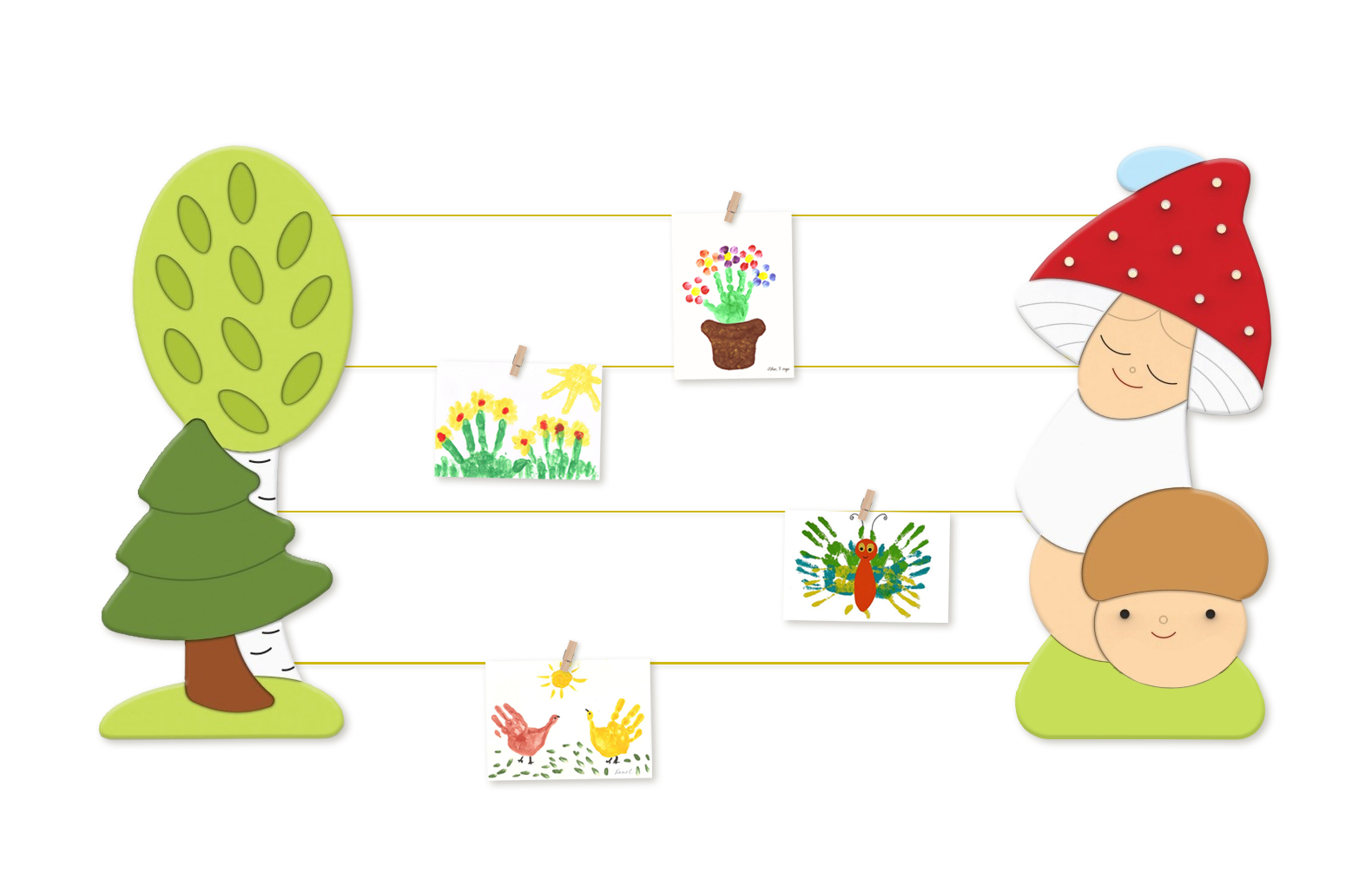 Рисунки и информация крепятся на элементы с помощью декоративных прищепок.