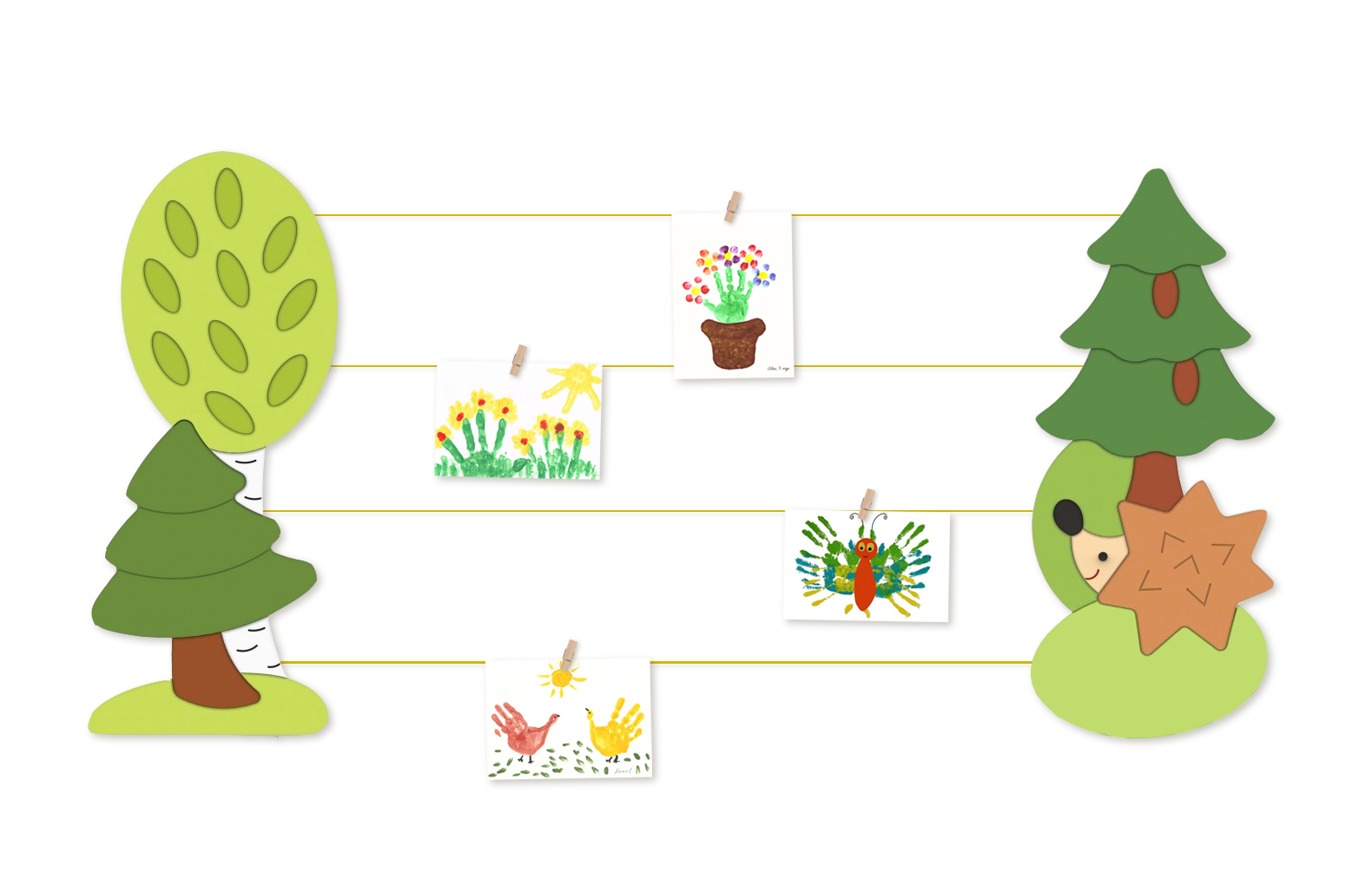 Рисунки и информация крепятся на элементы с помощью декоративных прищепок.