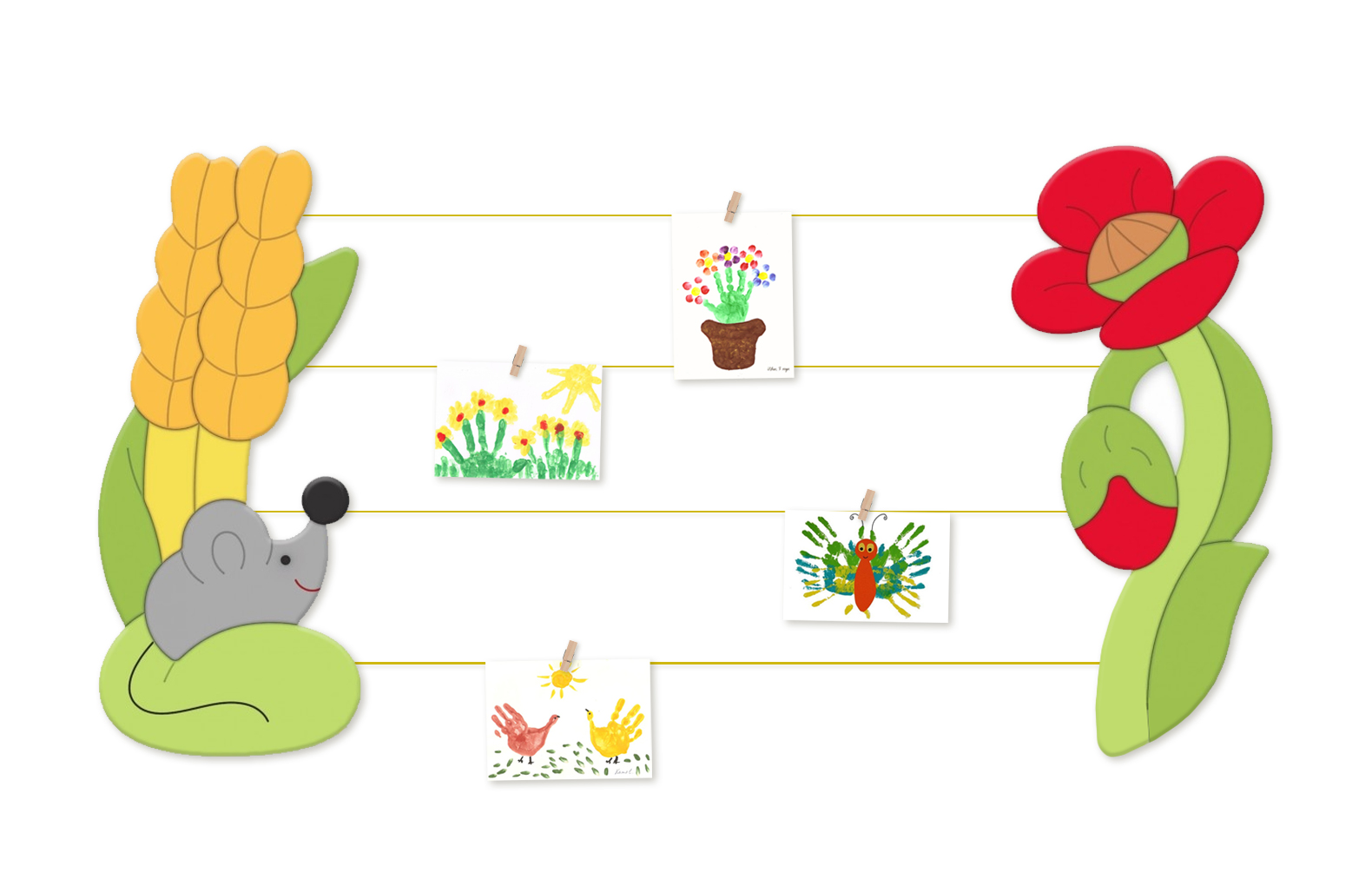 Рисунки и информация крепятся на элементы с помощью декоративных прищепок.