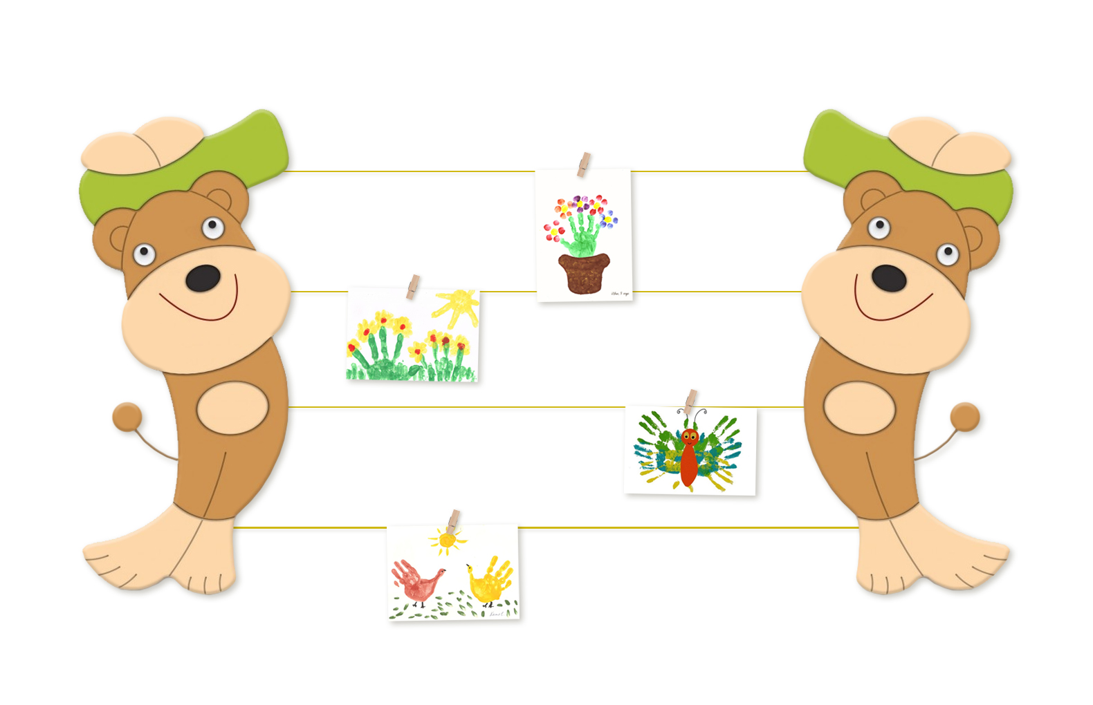 Рисунки и информация крепятся на элементы с помощью декоративных прищепок.