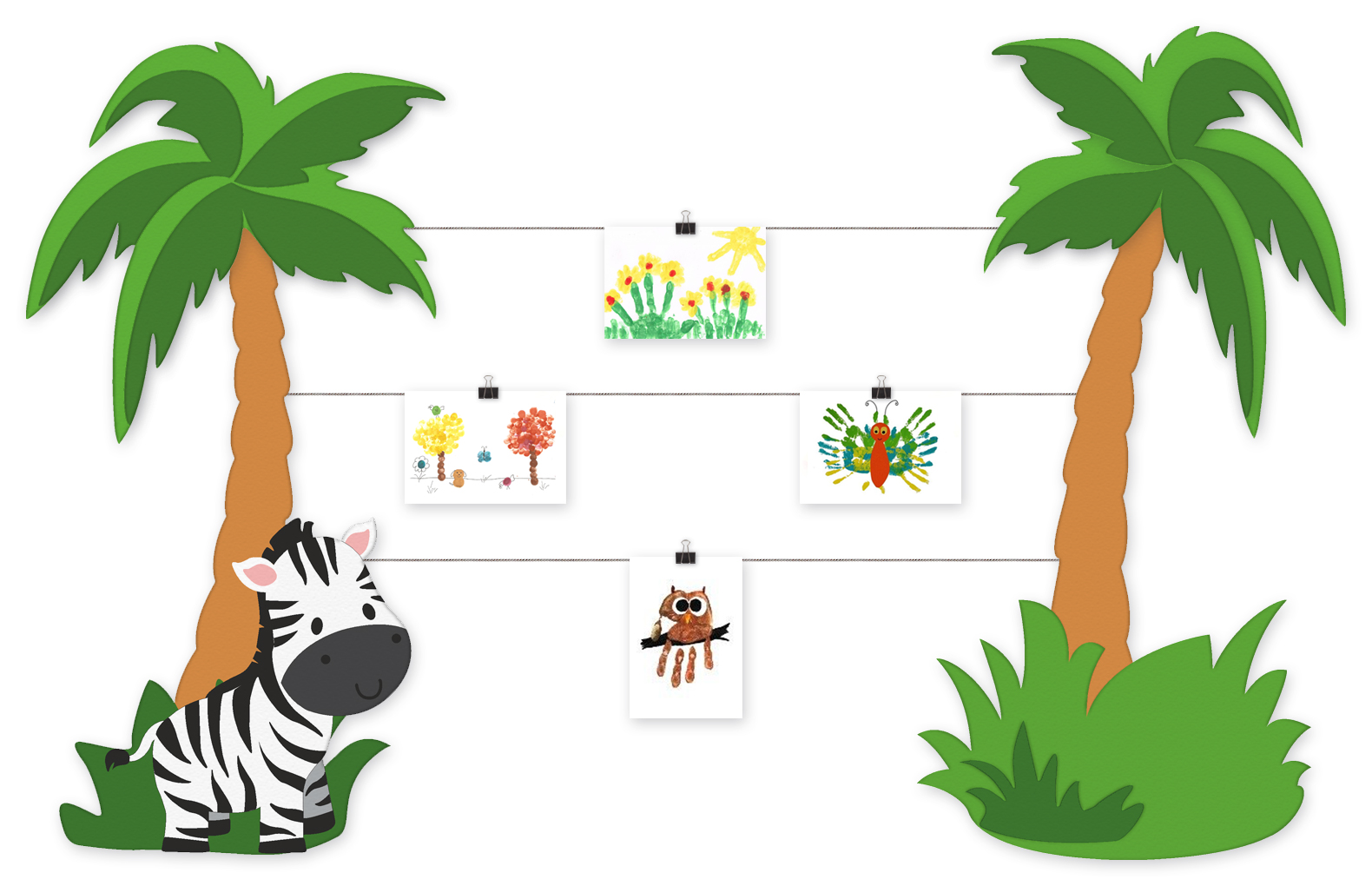 Рисунки и информация крепятся на элементы с помощью декоративных прищепок.