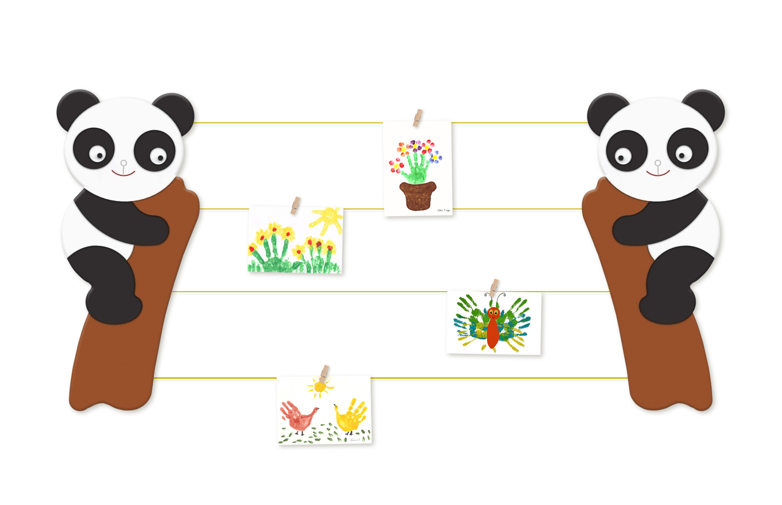 Рисунки и информация крепятся на элементы с помощью декоративных прищепок.