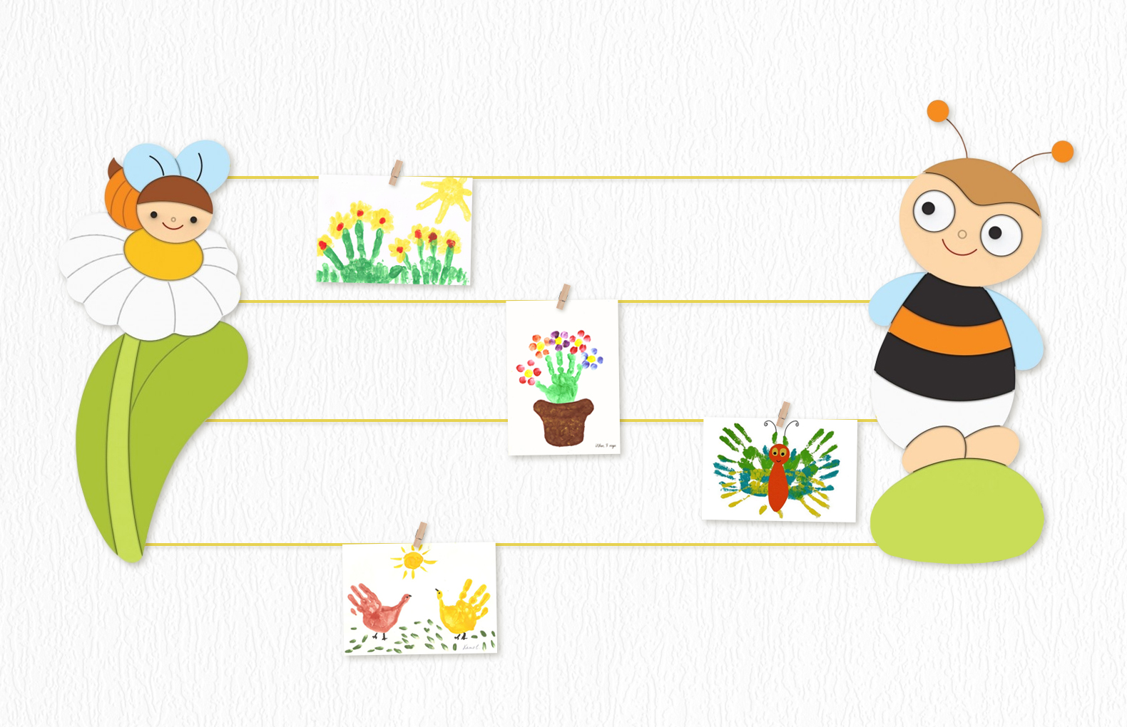 Рисунки и информация крепятся на элементы с помощью декоративных прищепок.