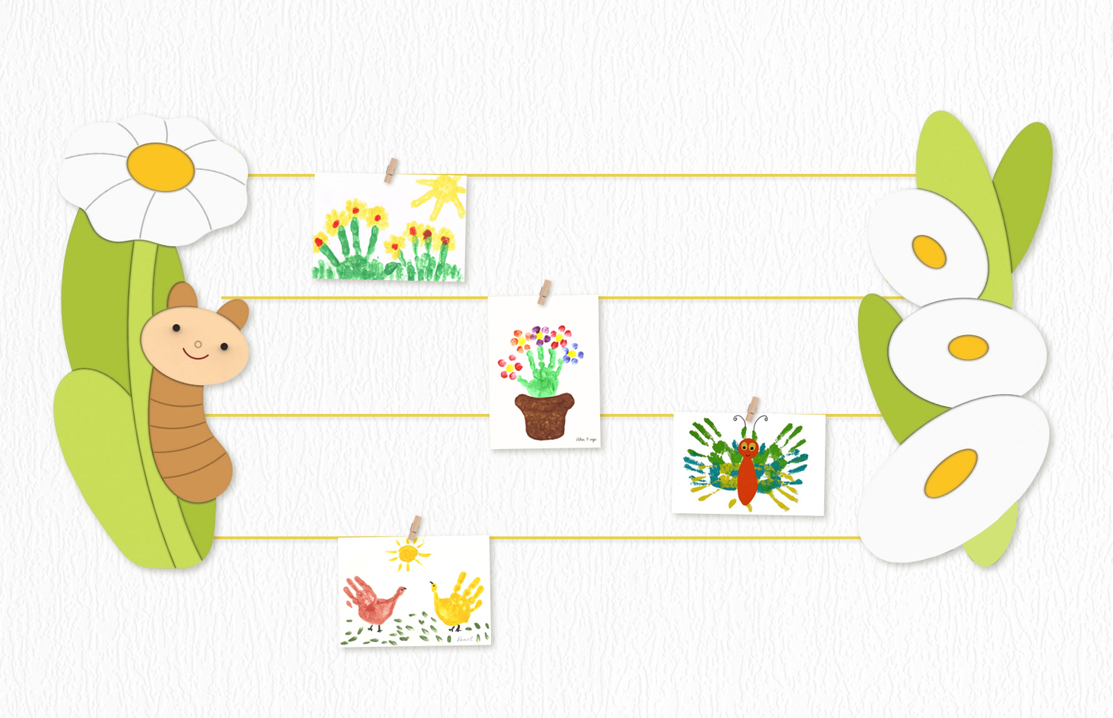 Рисунки и информация крепятся на элементы с помощью декоративных прищепок.