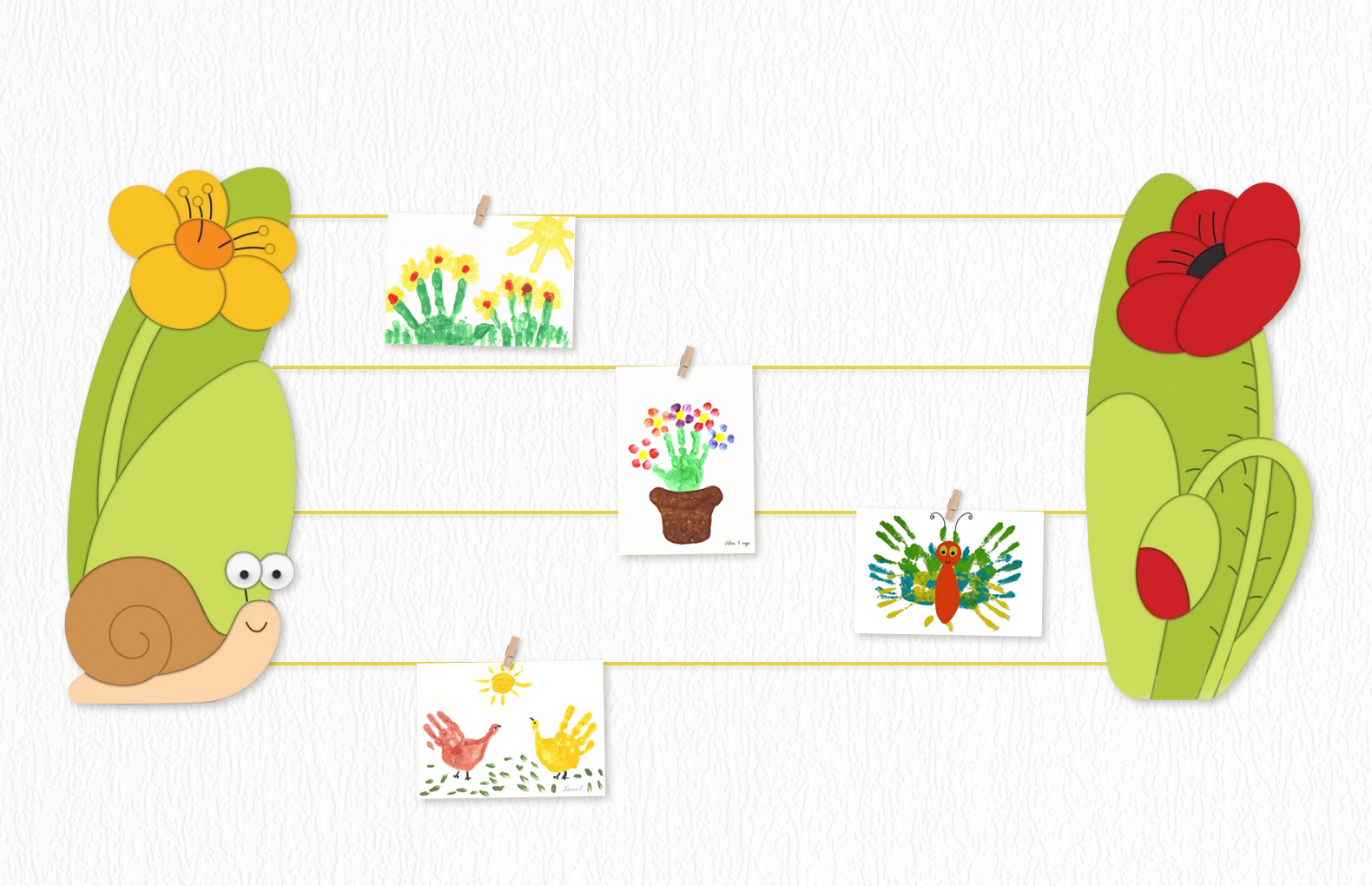 Рисунки и информация крепятся на элементы с помощью декоративных прищепок.