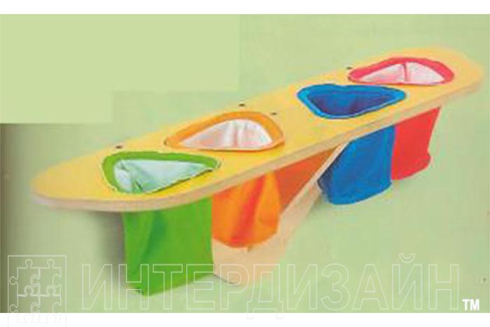 Полка с четырьмя маленькими чехлами из ткани разного цвета, в них кладутся различные мелкие предметы, которые ребенок должен определить на ощупь. Эта игра хорошо развивает фантазию ребенка.
