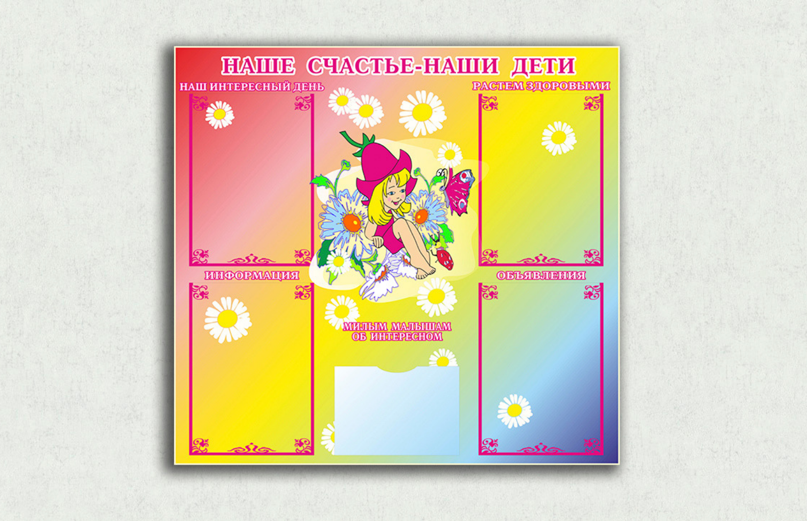 Изделие довольно лёгкое и изготовлено из экологически чистых материалов: художественного холста, деревянного подрамника. Конструкция оборудована 5 прозрачными карманами с готовыми названиями ячеек, позволяющие разместить следующую информацию: наш интересный день, растем здоровыми, информация, милым малышам об интересном, объявления.