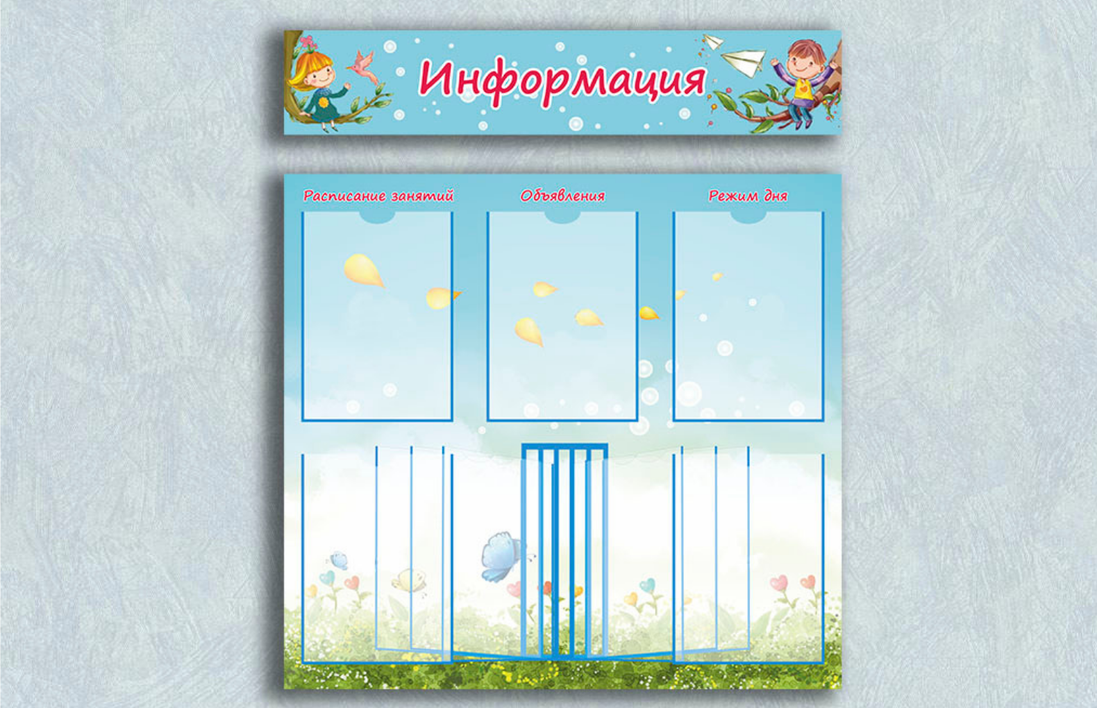 Информационный эко-стенд применяется для презентации детского сада. Это одна из возможностей не вербального общения специалистов дошкольного заведения с родителями. На эко-стенде есть готовые названия ячеек для расписания занятий, режиме дня и объявлений, куда вкладывают печатные листы.