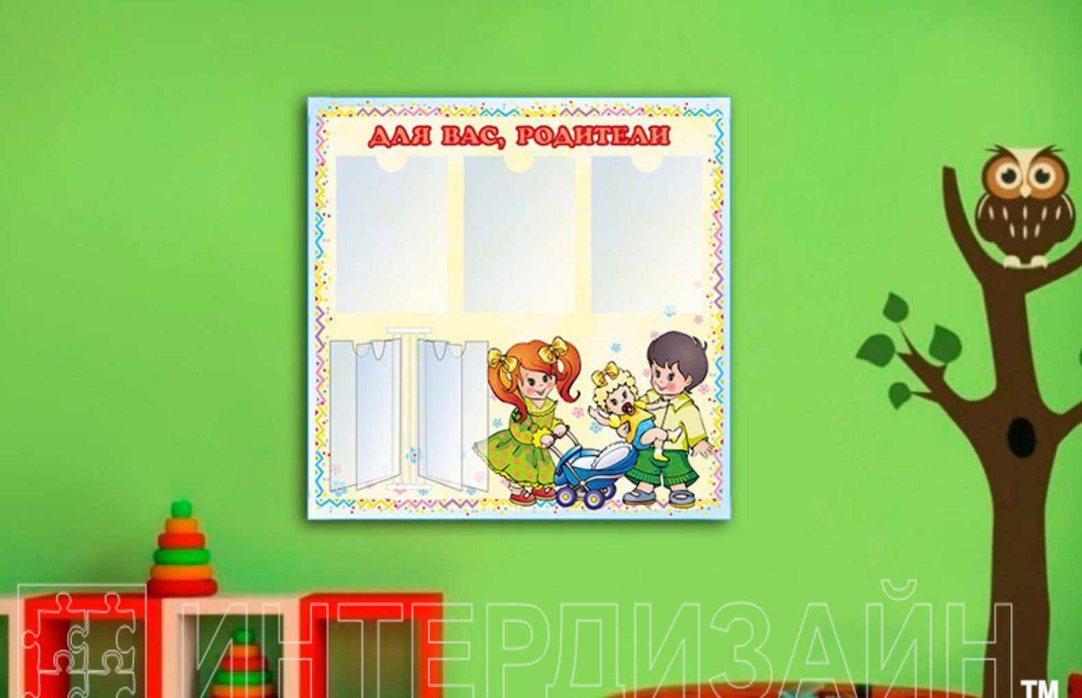 Эко-стенд для детского сада несёт информационную нагрузку, а также прекрасно вписывается в интерьер, как живописный элемент декора. Стенд на холсте «Для Вас, родители!» с оригинальной иллюстрацией незаменим в современном детском саду.