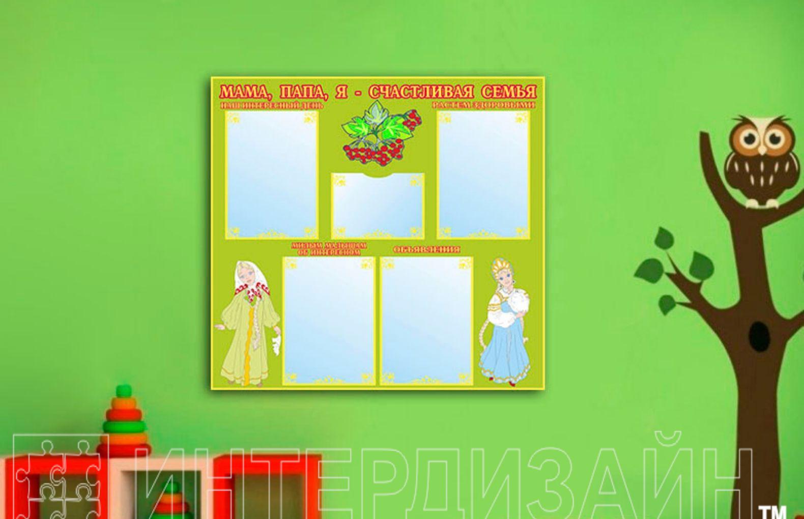 Эко-стенд «Счастливая семья» — это функциональный элемент, он предназначен для эстетического воспитания малышей. Это одна из возможностей невербального общения специалистов дошкольного заведения с родителями. На информационном стенде есть готовые названия ячеек: растём здоровыми, наш интересный день, милым малышам об интересном, объявления для расписания занятий.