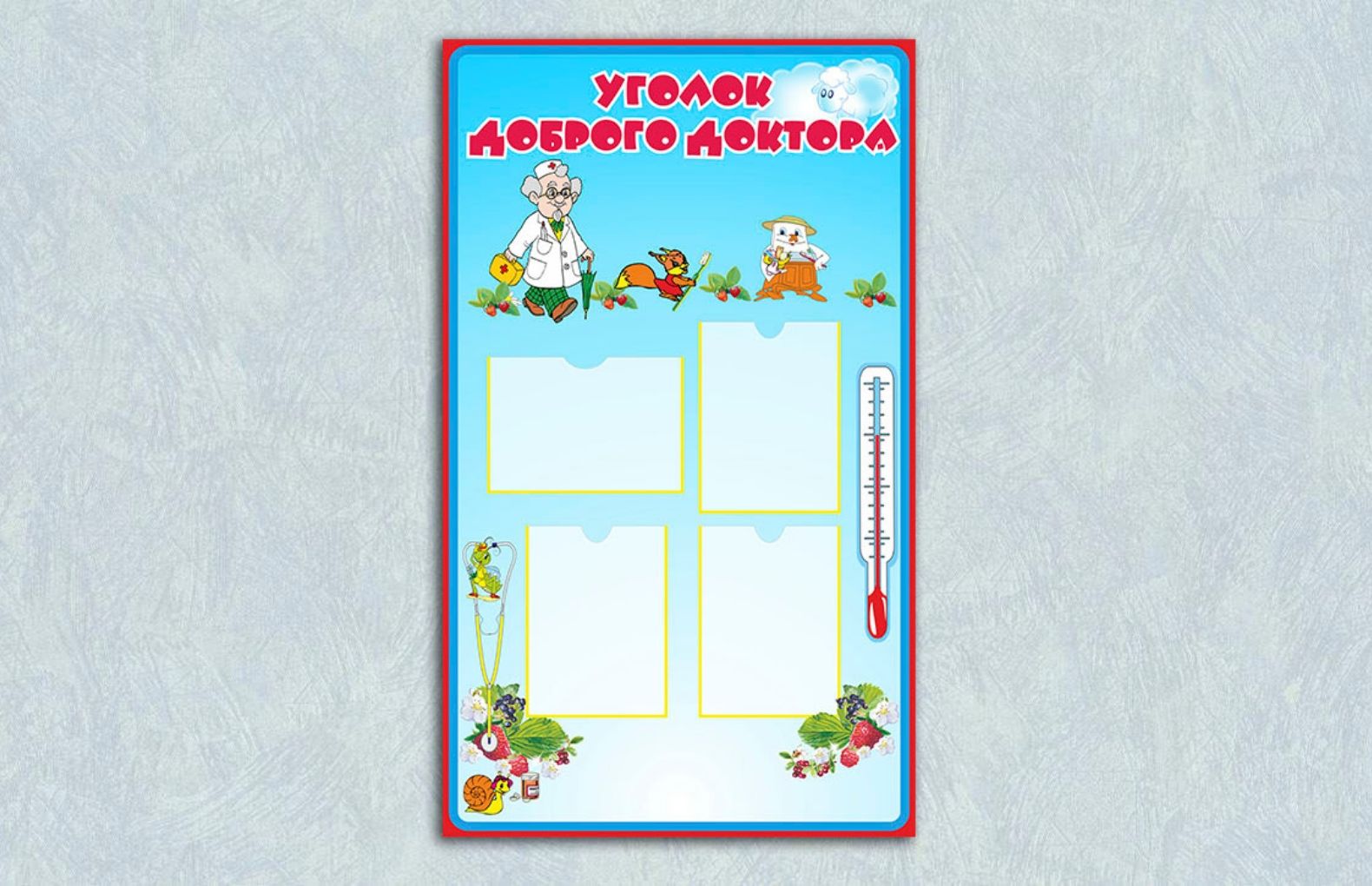 Эко-стенд «Уголок доброго доктора» для объявлений не только вмещает в себя всю актуальную информацию, но и принесёт в помещение коридора, кабинета, группы уют и хорошее настроение.