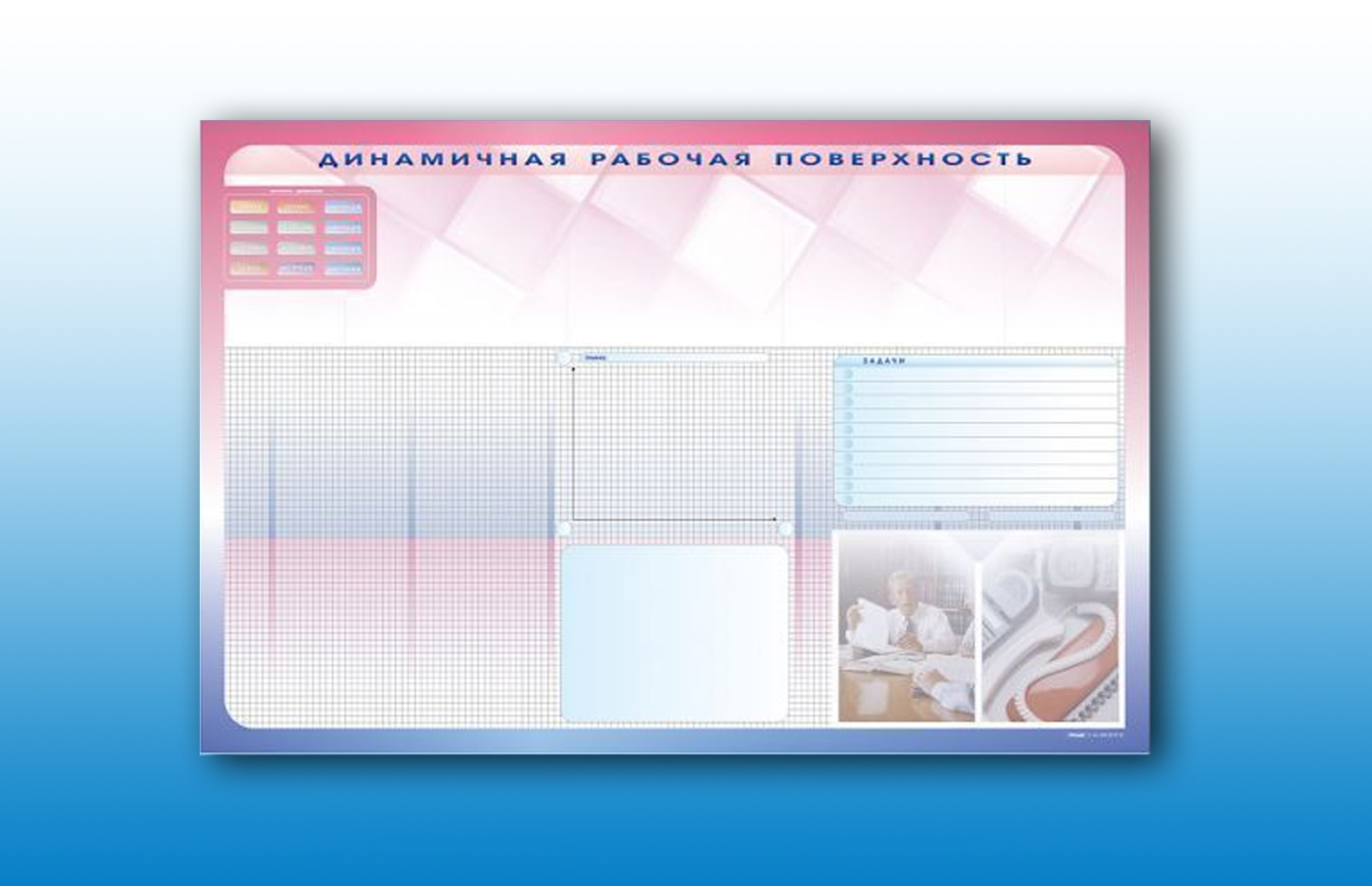 Информационная магнитно-маркерная доска представляет собой разлинеенное поле для обозначения и планирования рабочего дня, записи задач, сроков и исполнителей.