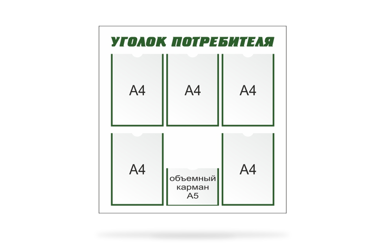 Стенд оснащен 5-ю карманами формата А4 и 1 объемным карманом А5 для книги отзывов.