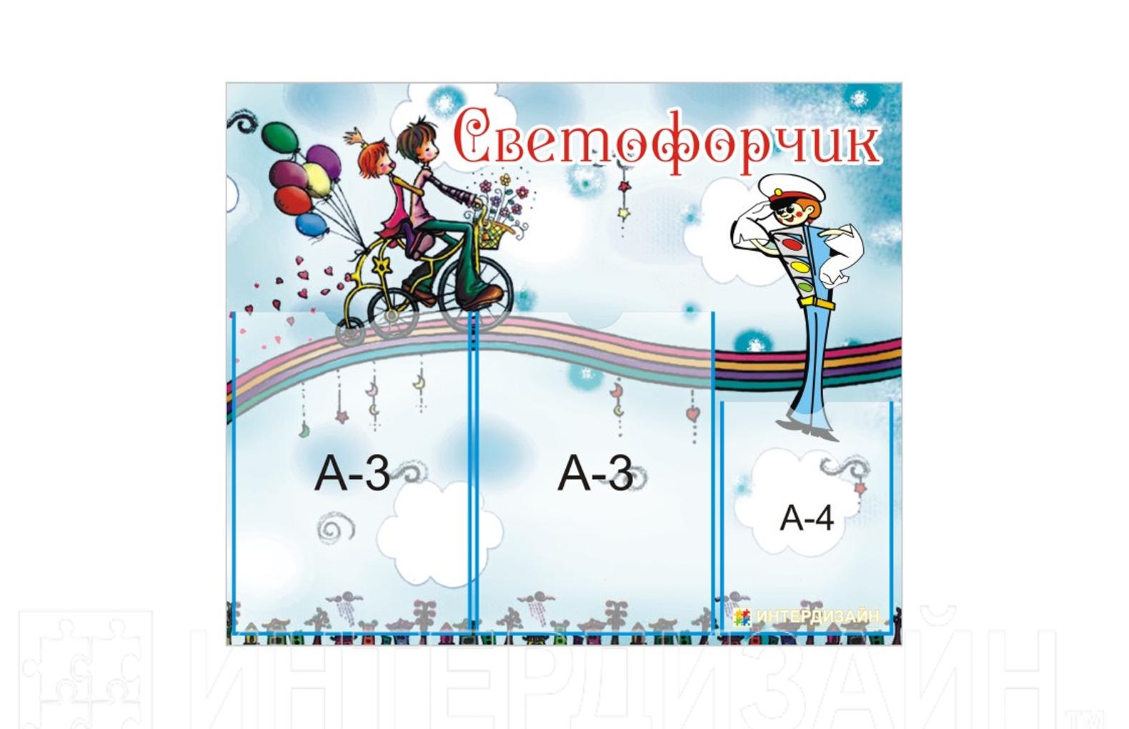 Оригинальный стенд "Светофорчик" изготовлен из прочного пластика с 2 карманами А3 и 1 карманом А4 форматов.