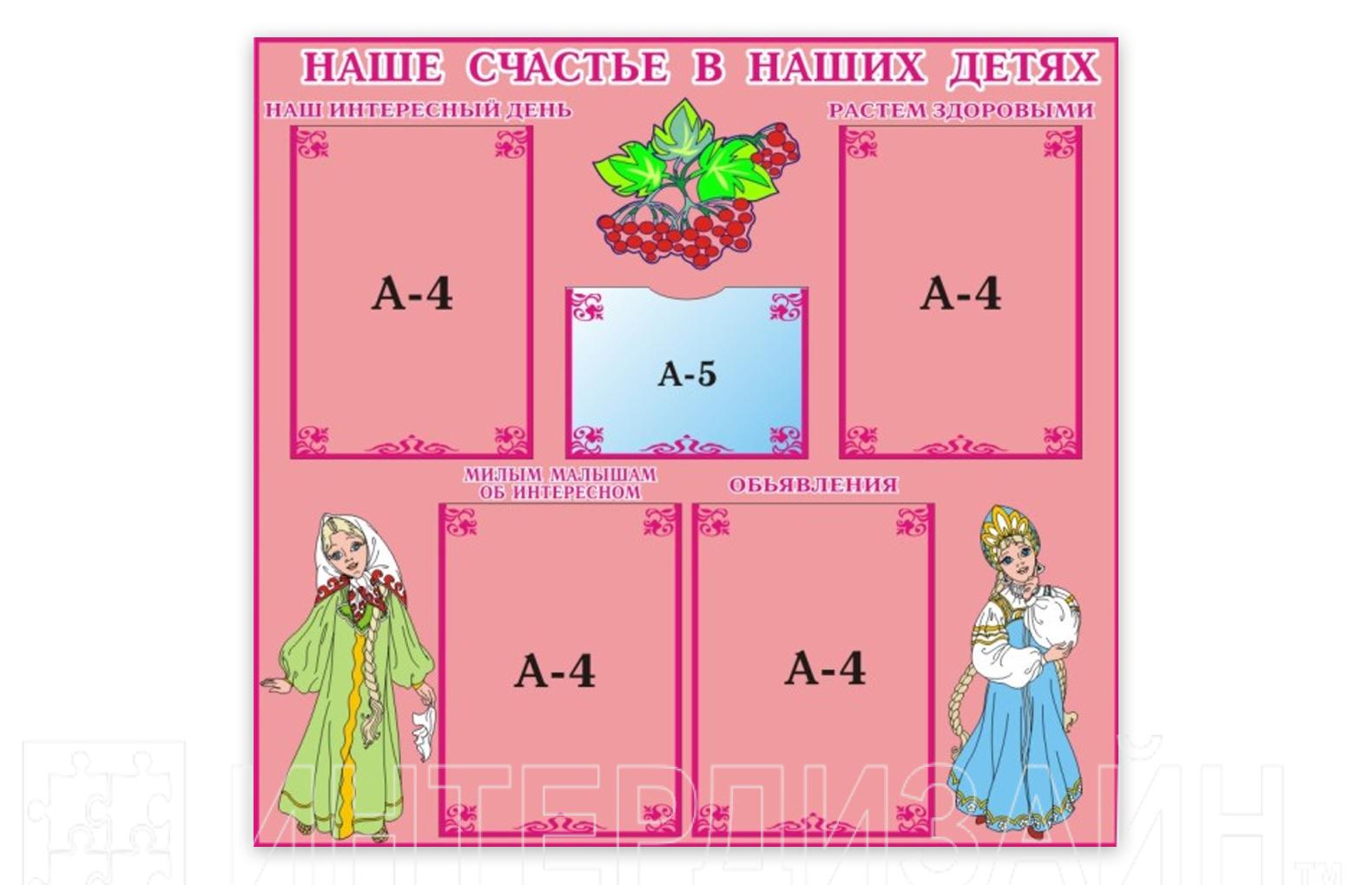 Дополнительно стенды компании ИНТЕРДИЗАЙН могут быть оснащены следующим оборудованием: "Карманами" для вставки листов и фотографий стандартных форматов. "Карманы" изготовлены из прозрачного ПВХ толщиной 0,5 мм и надежно закреплены на стенде. Стандартная глубина объемных "карманов" 15 мм. Металлическими пластинами для крепления листов или рисунков магнитом. Металлическими крючками для полотенец (в стендах для дежурств). Вращающимися стрелками (в Календарях природы). Полочками для изделий из пластилина (в стендах-подставках для лепки) По желанию заказчика надписи и цветовое оформление могут быть изменены.