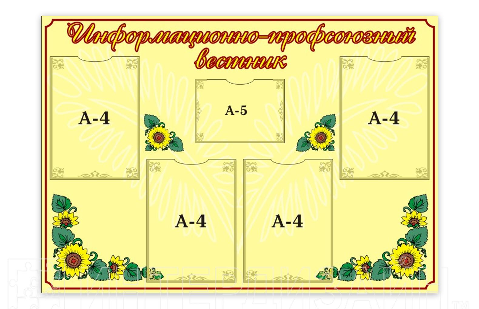 "Карманами" для вставки листов и фотографий стандартных форматов. "Карманы" изготовлены из прозрачного ПВХ толщиной 0,5 мм и надежно закреплены на стенде. Стандартная глубина объемных "карманов" 15 мм.