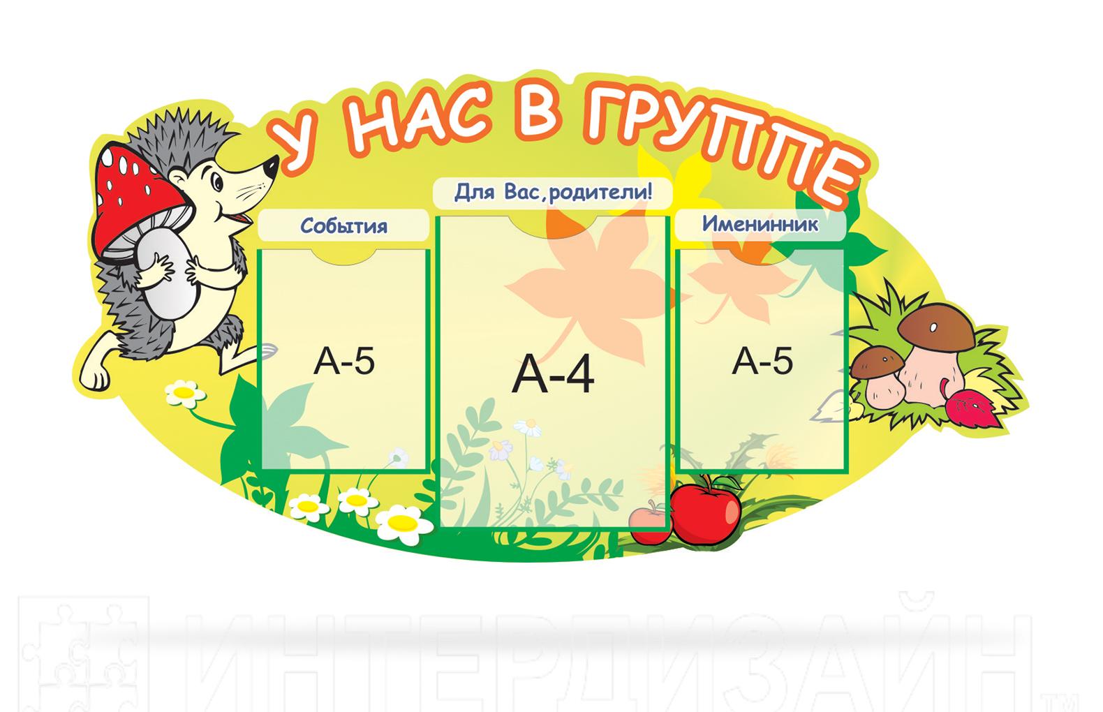 Стенд изготовлен из пластика ПВХ толщиной 3 мм. Изображение наносится на пленку или непосредственно на пластик. Дополнительно стенд оборудован 2 карманами А5, карманом А4 форматов, в которые можно раскладывать карточки с персональными картинками детей.